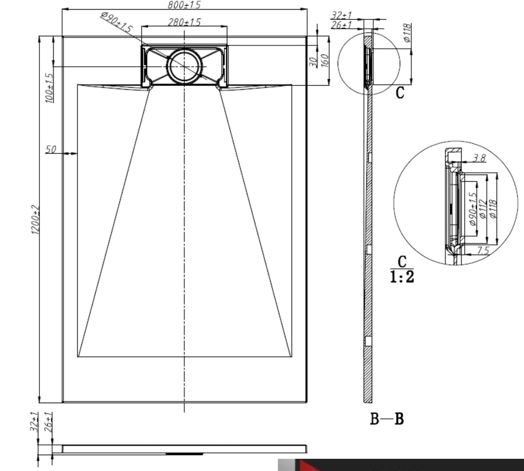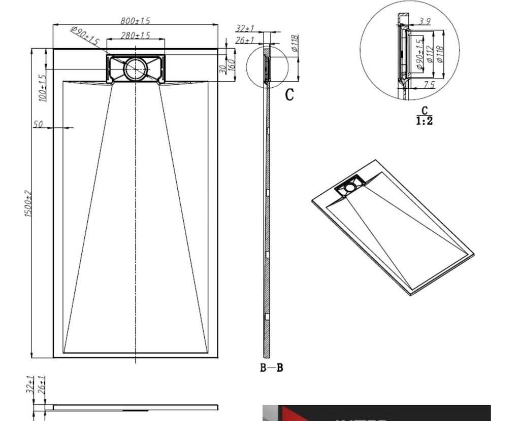 - In case of installation with a corner shower, the gypsum must be installed back the base, the ceramic is installed on the base, see the actual sizes below.