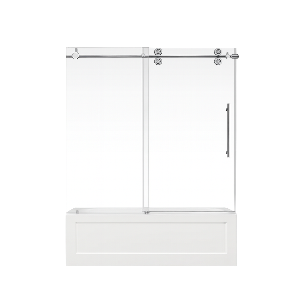 The ZARO bath door combines elegance and durability brilliantly, its minimalist design will enhance any bathroom project. Made of 8MM tempered glass, the door is very resistant to possible everyday impacts. Robust hardware made of stainless steel ensures longevity that exceeds the most rigorous industry standards. The 4-wheel bearing system distributes weight on the rail evenly ensuring firm and smooth sliding. Products in the ZARO range are offered in black or chrome. The doors are reversible and can be installed on a 60" alcove bathtub.